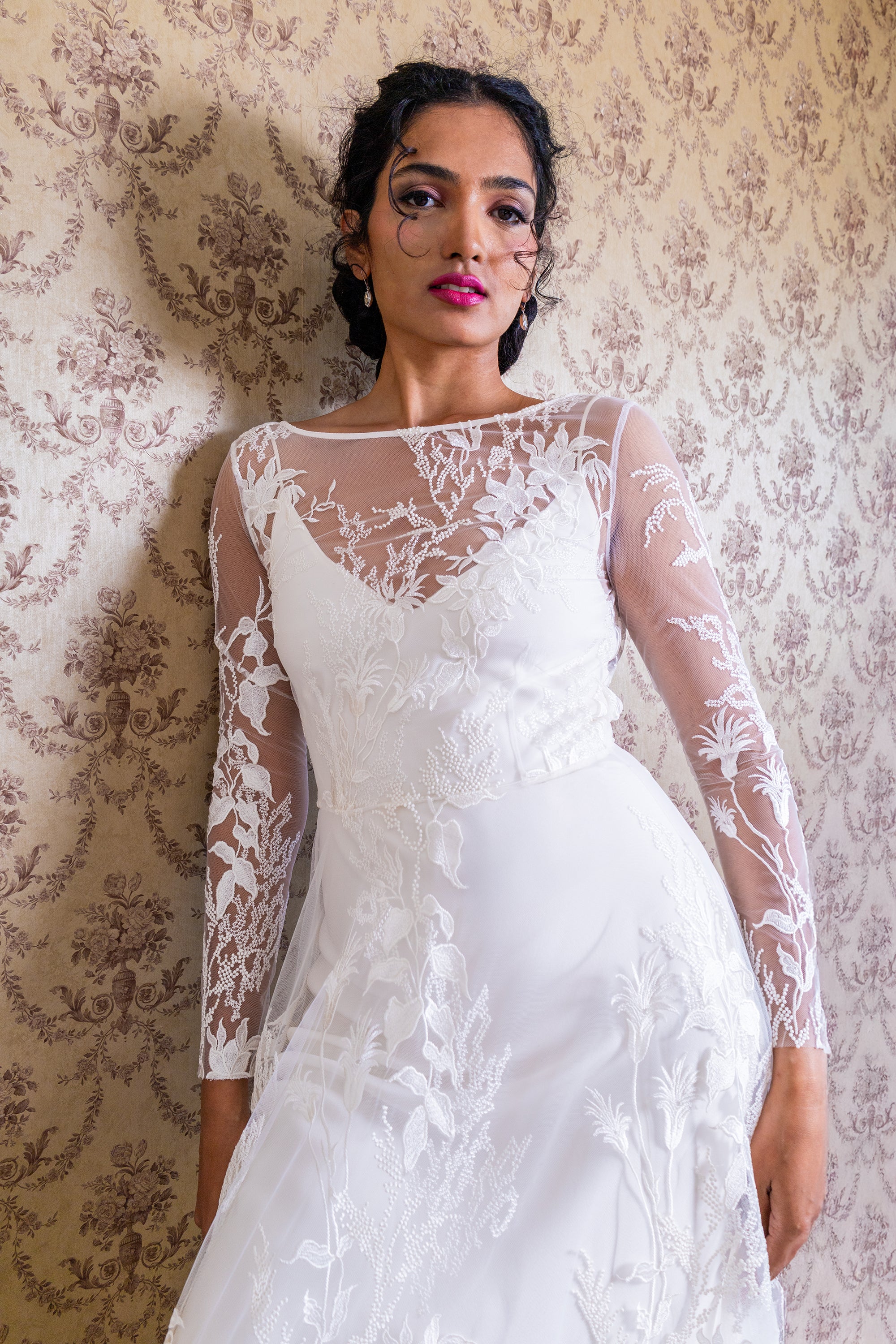 A bold Spanish corded lace wedding dress with long lace sleeves, a high illusion neckline, low back and cap sleeves. The price includes its own slip called 'Love in a Mist slip' worn underneath the lace over-dress with spaghetti straps, low back and made from plant silk like our Elsa Sass dress is made from with a choice of either ivory or are new champagne gold that's naturally dyed with avocado and pomegranate seeds.