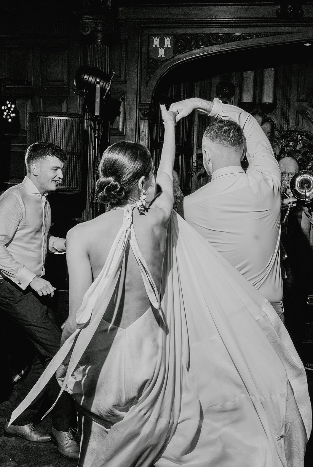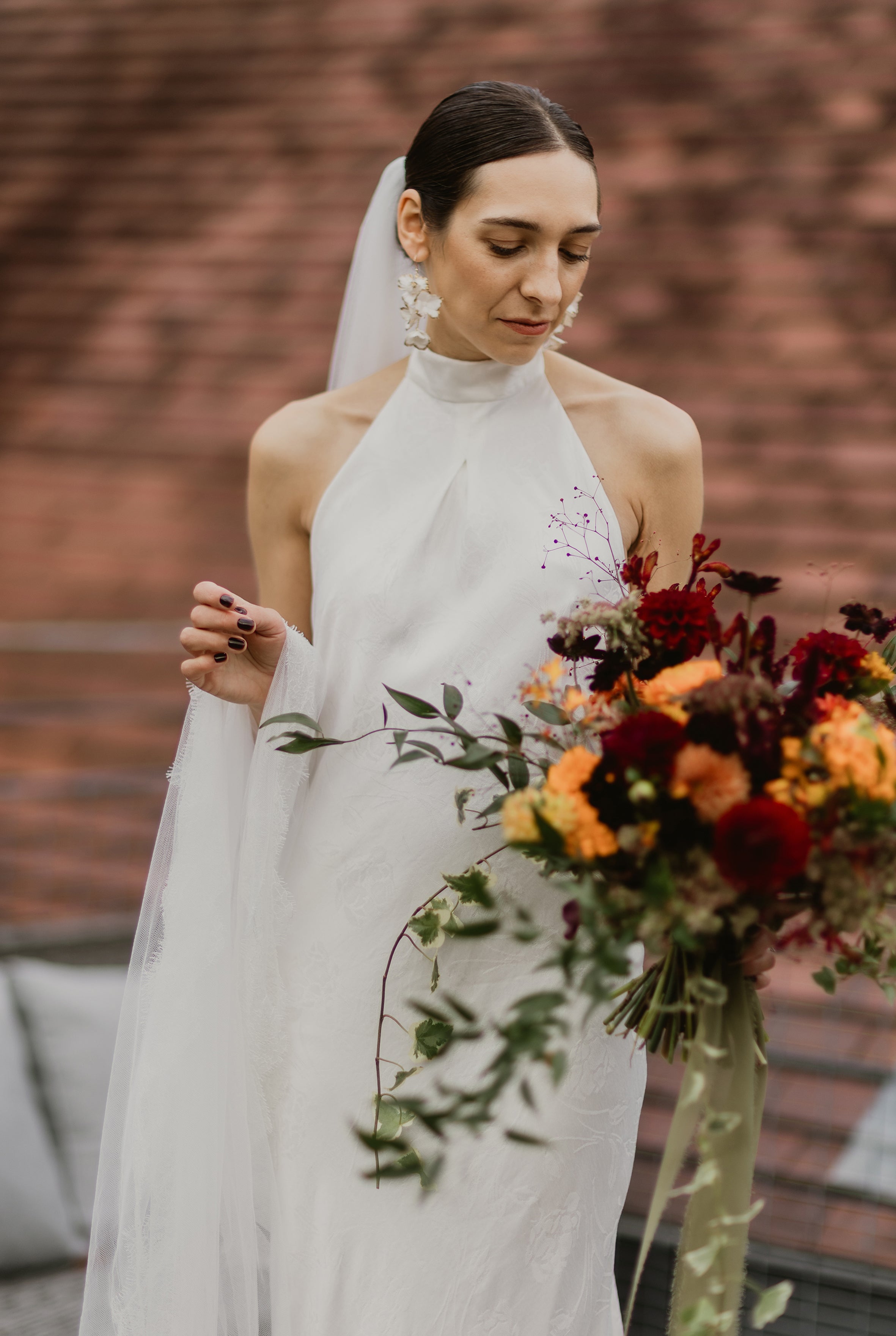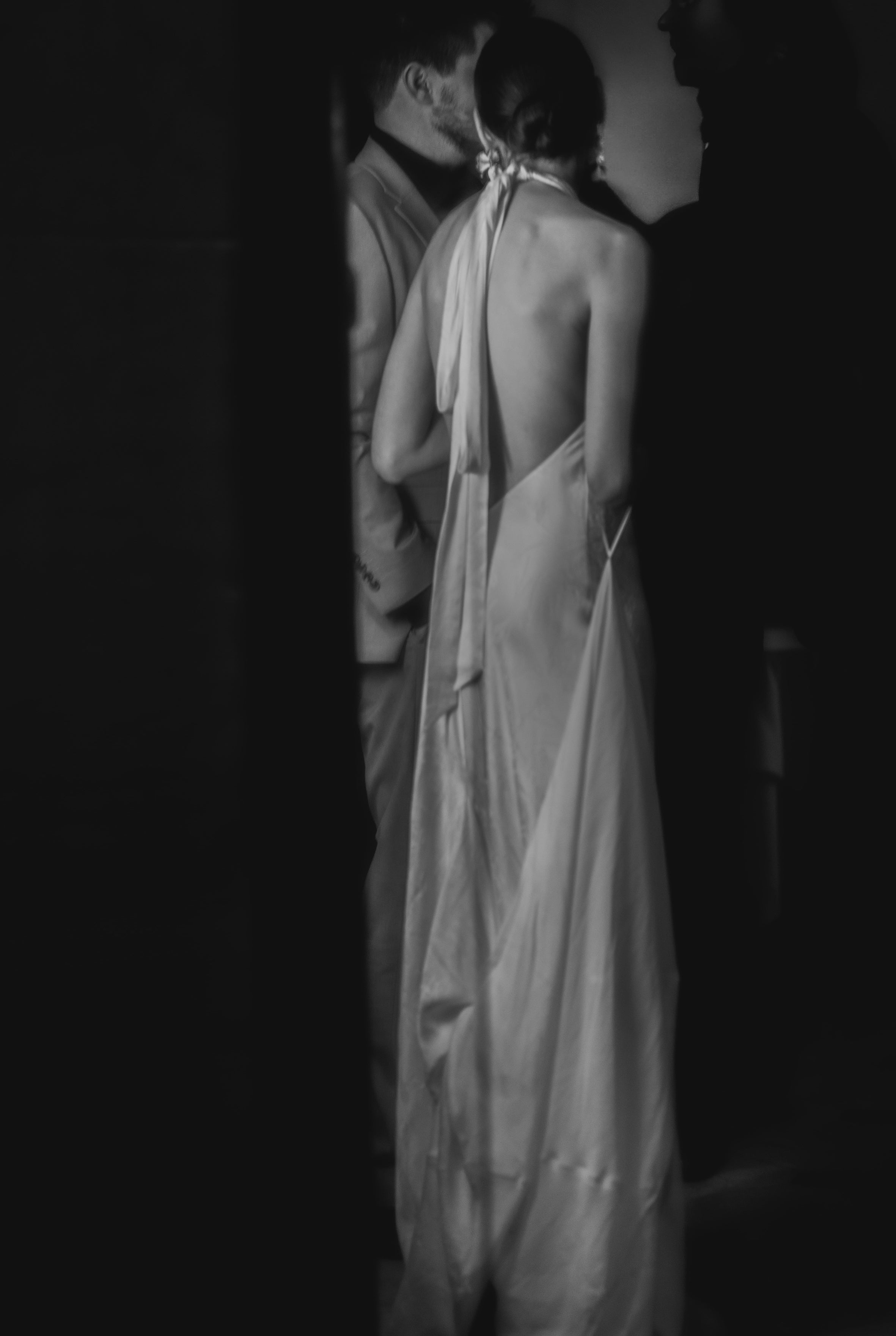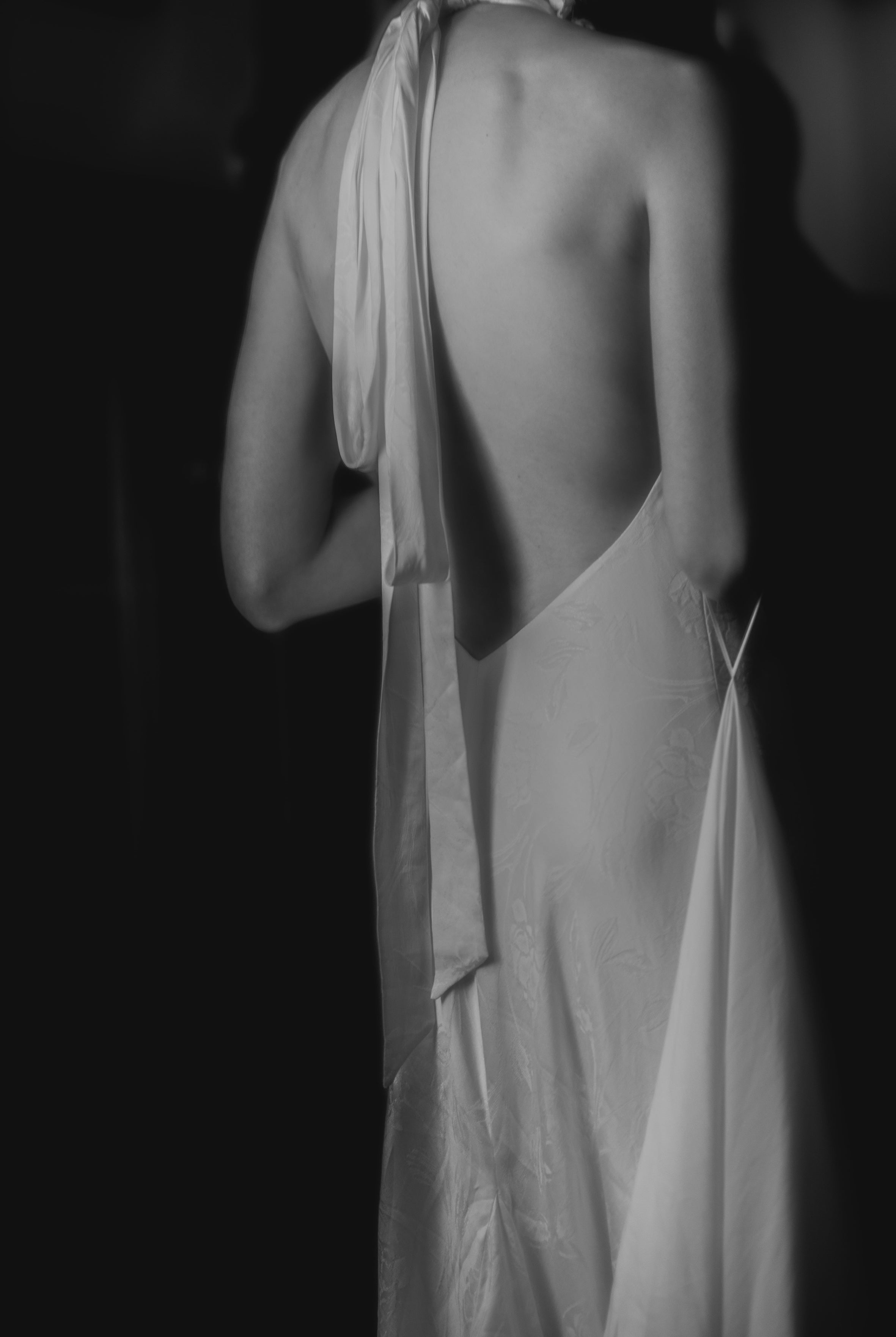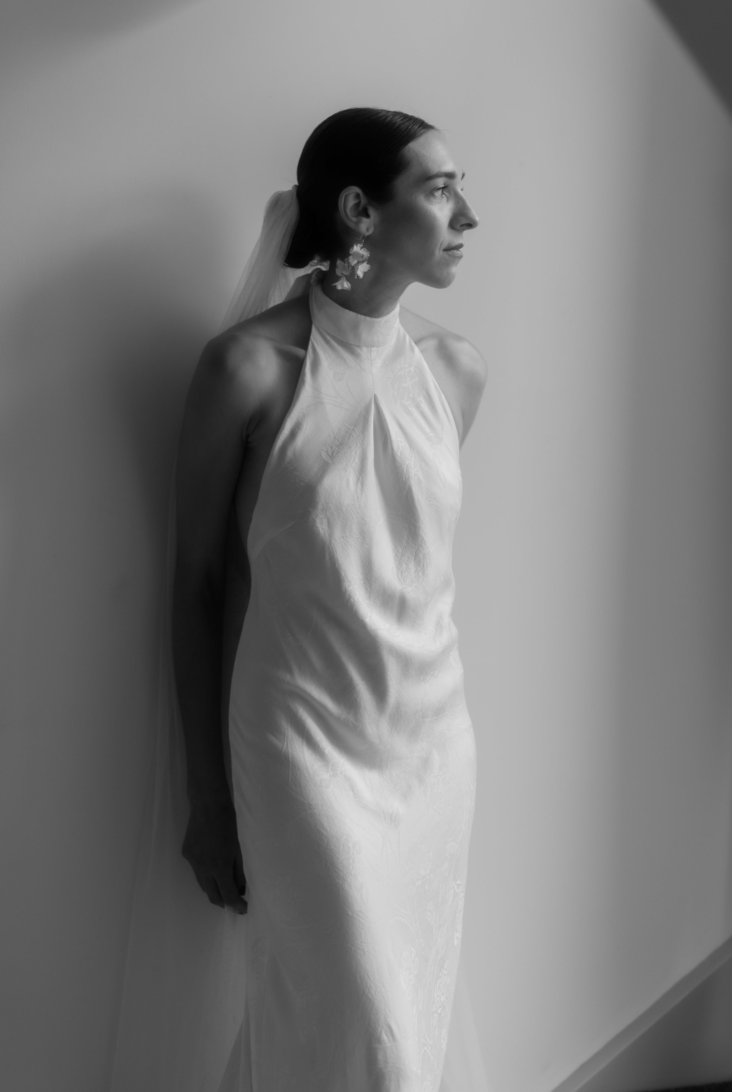 We created a custom version of our halter-neck wedding dress, Blazing Star with extra long neck ties, super low back and a centre front pleat.