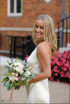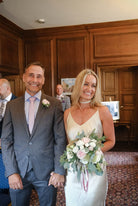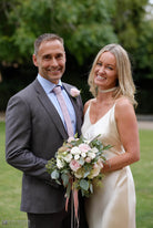 "I wore it to my wedding to Leo at Edes House, Chichester, and had so many compliments. As an ‘older’ bride I wanted something elegant, timeless and simple and this fitted the bill perfectly. I had the train shortened as I didn’t want a long train, and my seamstress friend made me a simple matching choker with some of the left over material. The gown was a dream to wear. I absolutely loved it, as did Leo!"