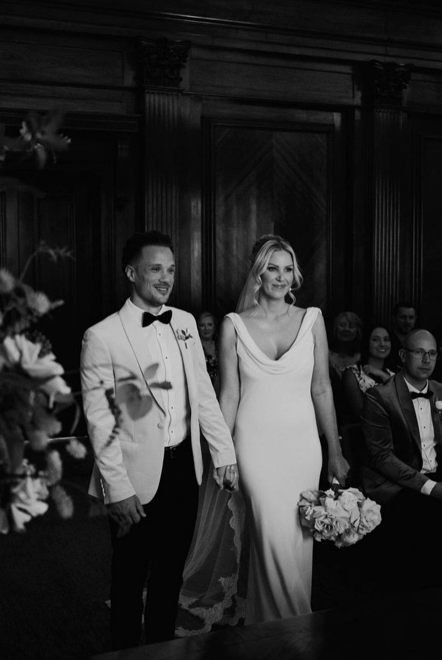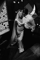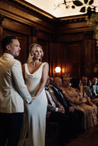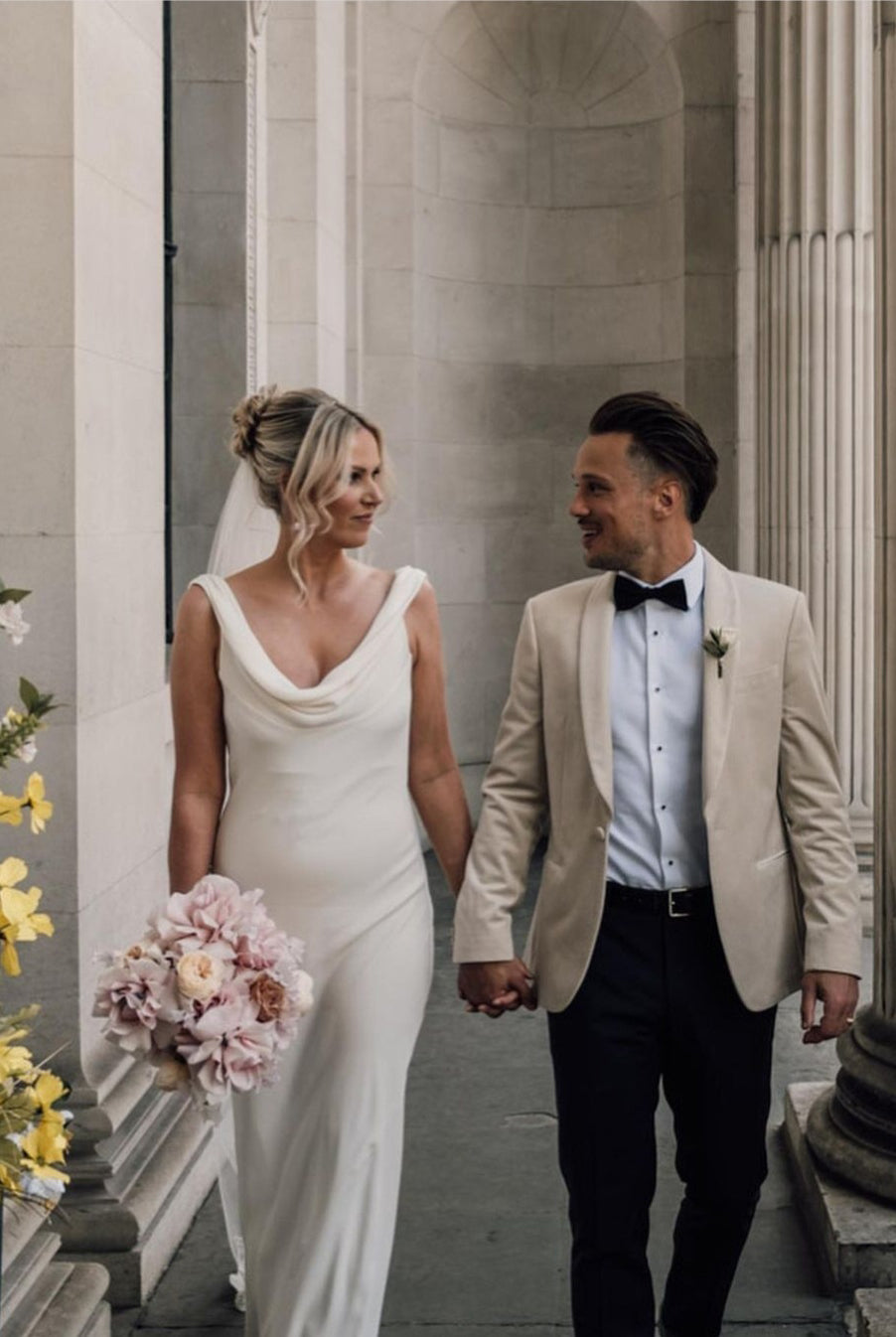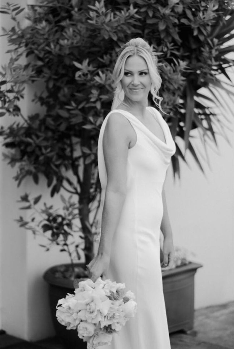 Rachel wears the Marceline dress, which is a soft cowl neck dress with a low cowl neck back, one of our much-loved styles made from the finest heavy silk crepe.