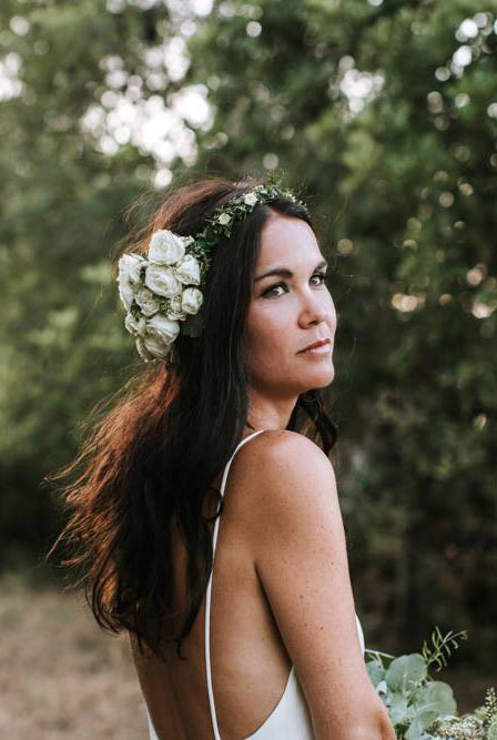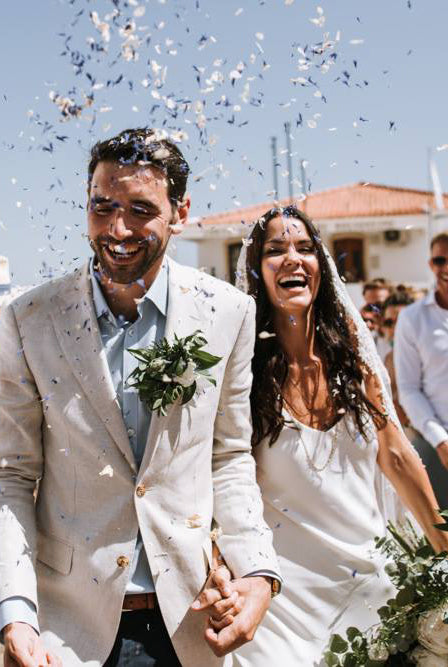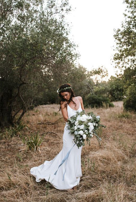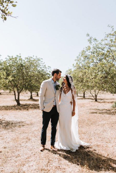 Beautiful Allana wears our Ivory crepe Elsa dress at her wedding in the Algarve.