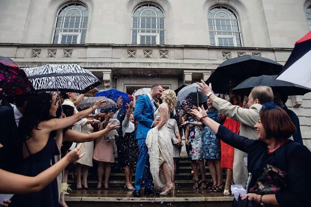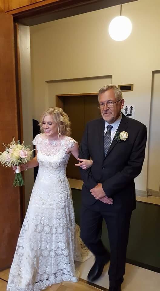 Kat married Alan, at the Hackney Townhall, and had the reception at Proud East on Hertford Road. She wore a gold satin dress with a scoop neck and low back called Mia from the new 2017 collection and a boho inspired lace dress called Mary over the top.