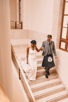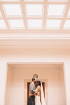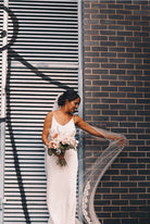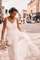Lizzy wears one our Elsa Ivory dress, with a low back, slinky skirt and rouleau straps, at her Eastend London Wedding at the Hackney Town Hall and Townhall Hotel.